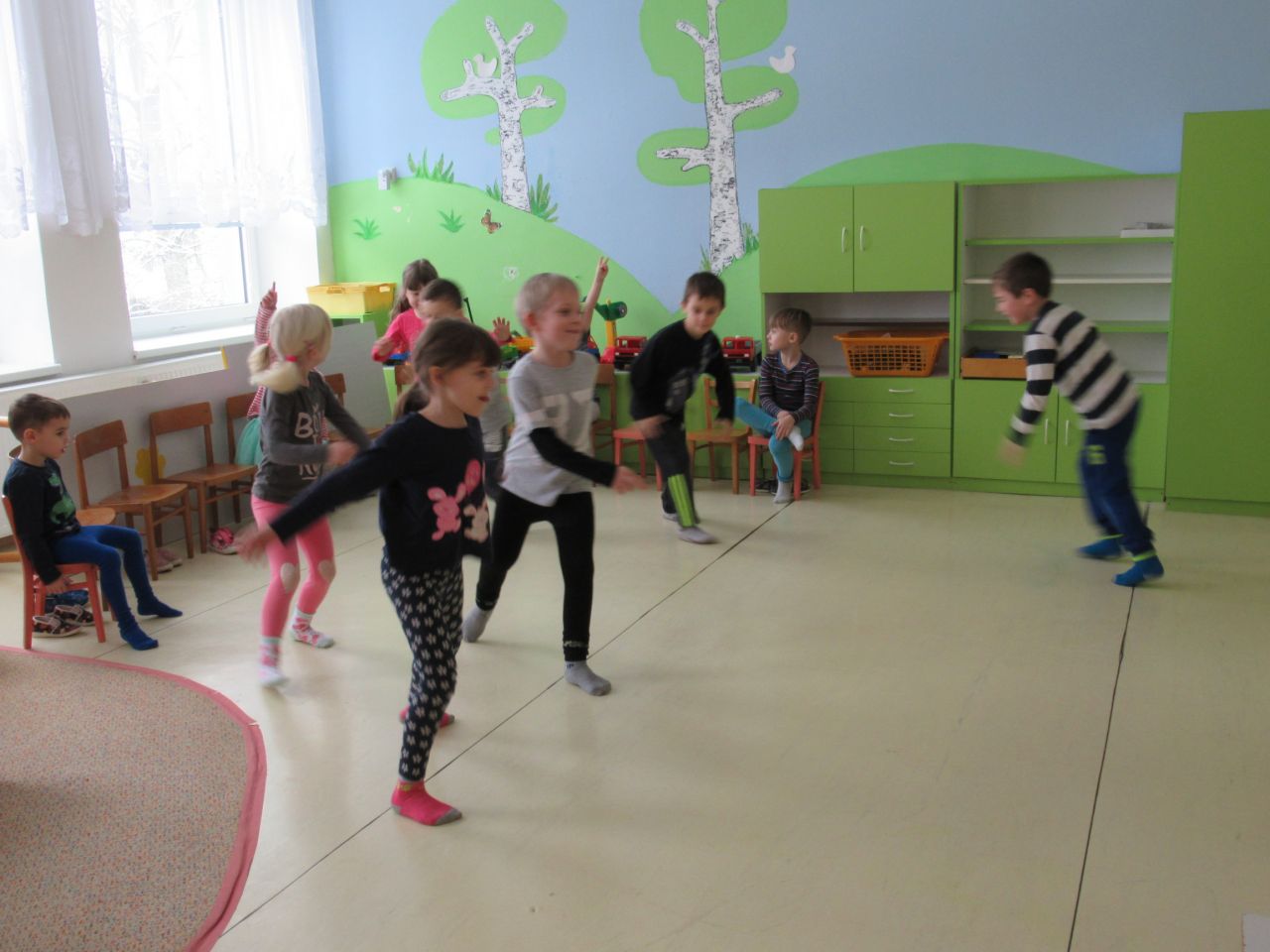 Další disciplíny z Olympijských her, které si děti vyzkoušely, byly rychlobruslení a krasobruslení. Na naleštěné podlaze to parádně klouzalo.